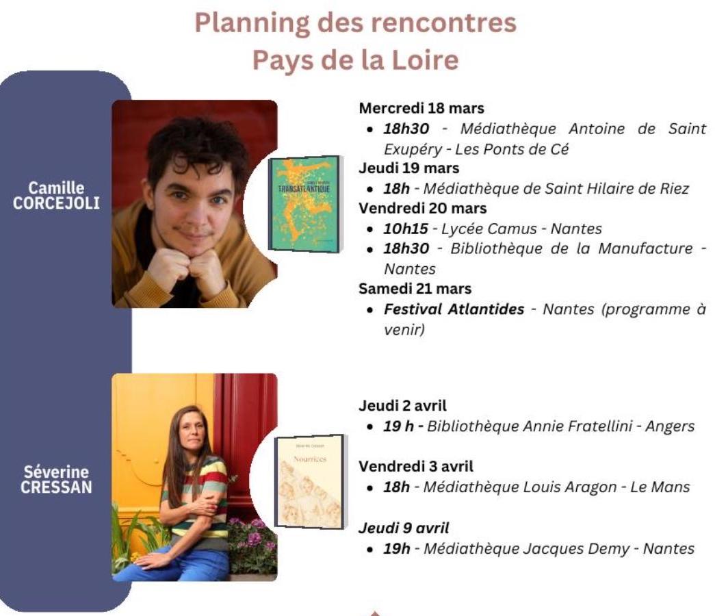 - Camille Corcéjoli (Transatlantique) du 18 au 21 mars. L’auteur sera accueilli dans le Maine-et-Loire, la Loire-Atlantique et la Vendée !