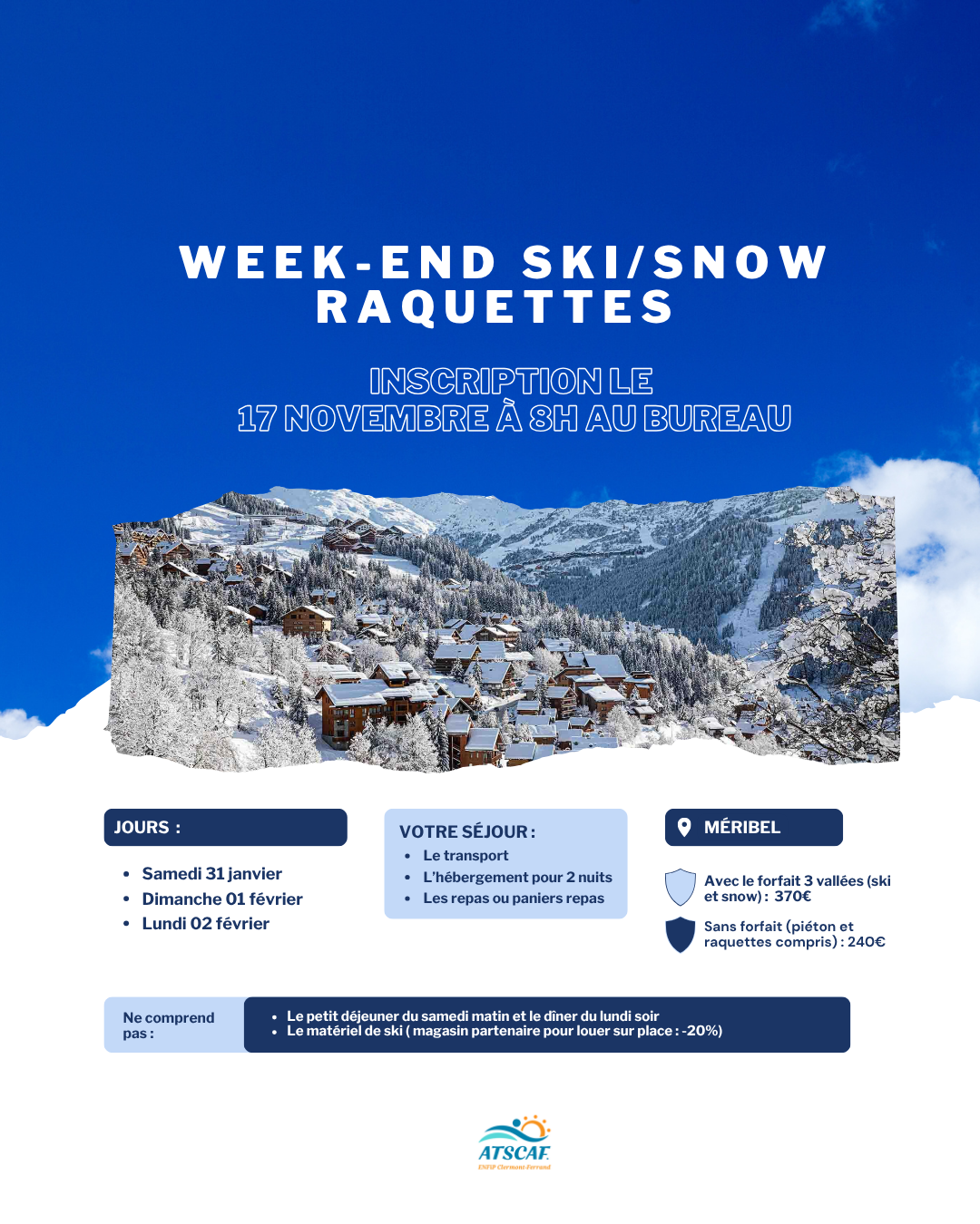 A compter 17 nov. : inscription week-end Méribel fin janvier