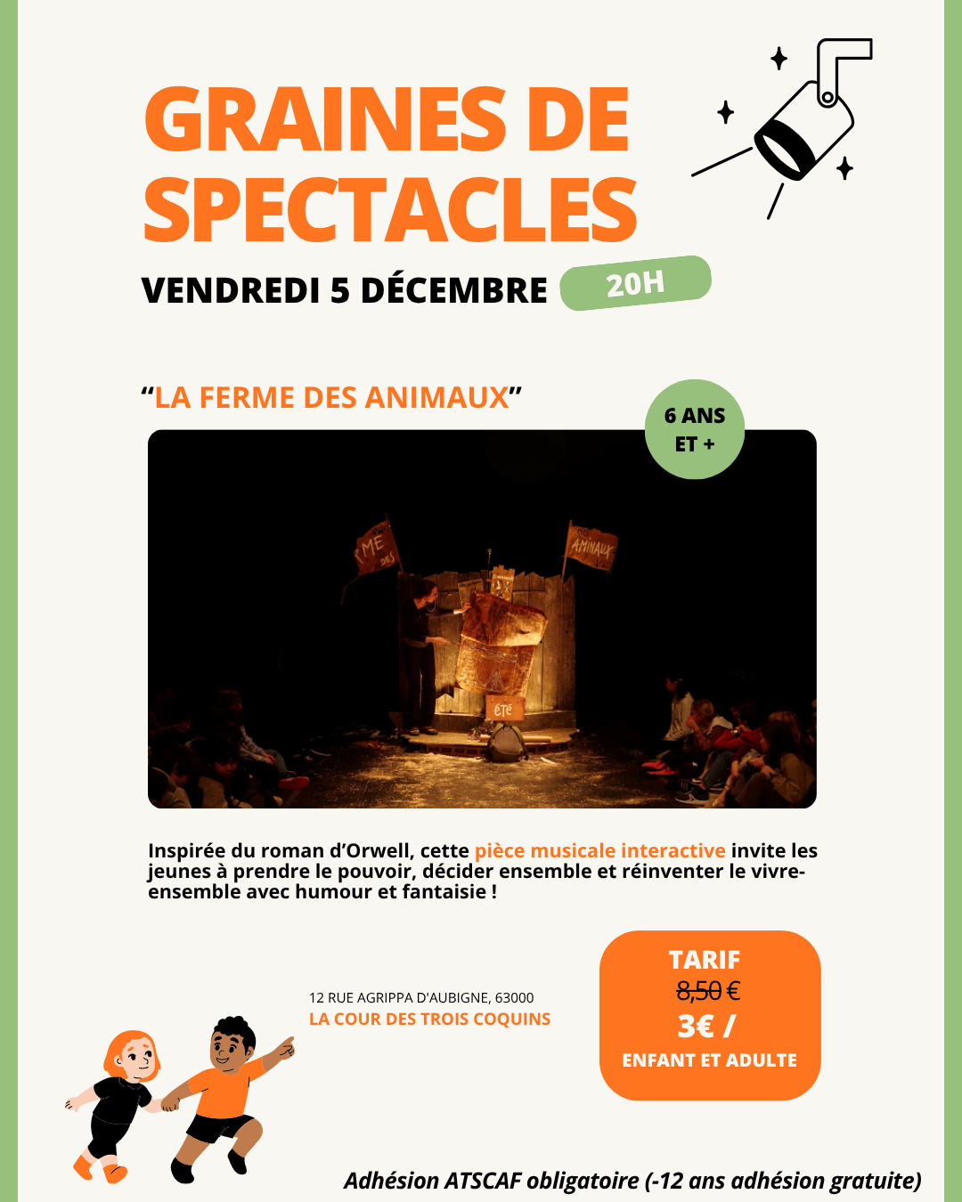 L'ATSCAF ENFIP Clermont-Ferrand vous propose une soirée spectacle pour les enfants de plus de 6 ans à la Cour des trois coquins à Clermont : "La ferme des animaux" : une pièce musicale interactive, inspirée du roman d'Orwell, qui invite les jheunes à prendre le pouvoir, à décider ensemble et à réinventer le vivre-ensemble avec humour et fantaisie.