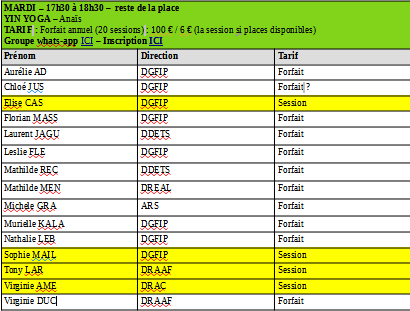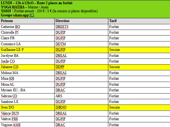 tous les lundi de 12h30 à 13h15 : cours de yoga - 5 € la session