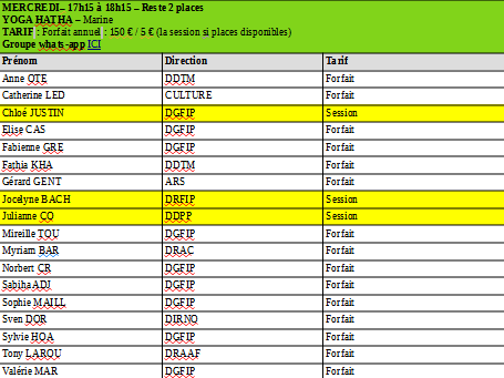 aux sessions du yoga en alternance selon les places disponibles